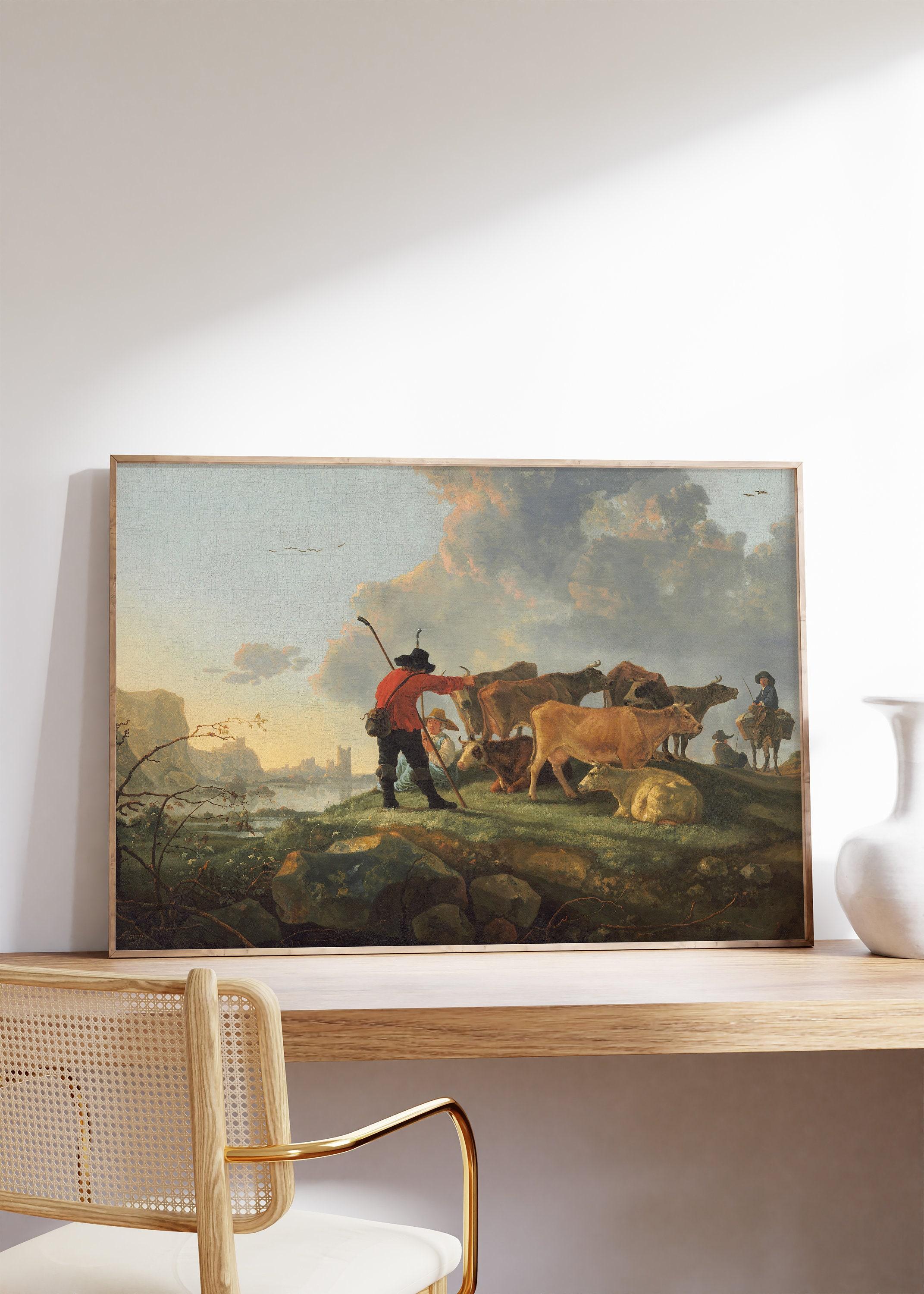 Printed on an premium luster photo paper, Aelbert Cuyp Herdsmen Tending Cattle 1655 Cloudy Sky posters are printed in San Francisco, CA. They are premium luster photo paper for best quality, with a high contrast black and white. The poster base has been coated with an edible resin coating that allows it to be safely stored away from direct light. High-quality resin-coated photo base paper medium A 260 gsm and a 10 mil thickness of paper. Last up to 200 years color and 400 years black-and-white