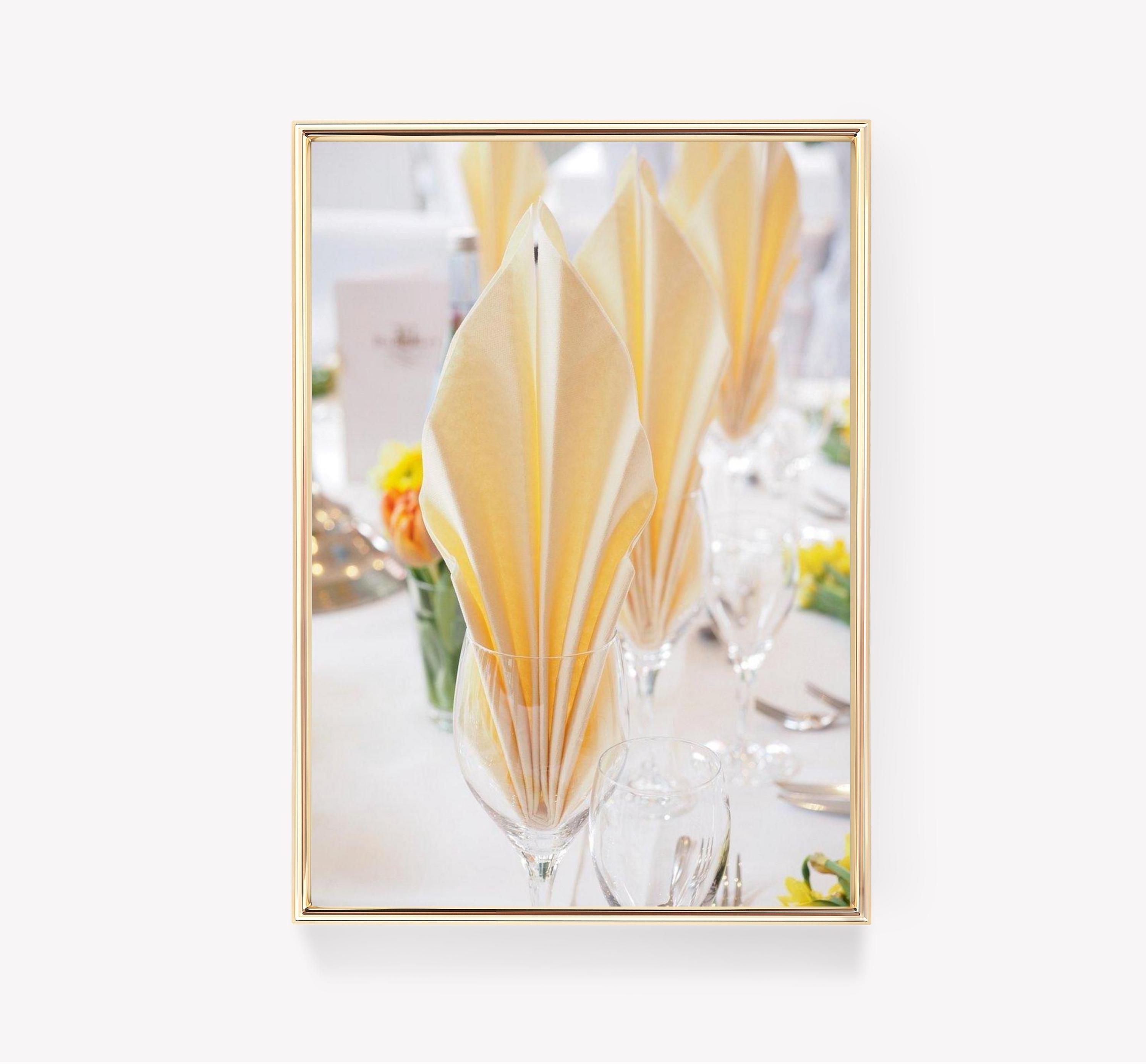 Printed on an premium luster photo paper, Elegant Banquet Decor Wine Glass Napkin Display Table Setting posters are printed in San Francisco, CA. They are premium luster photo paper for best quality, with a high contrast black and white. The poster base has been coated with an edible resin coating that allows it to be safely stored away from direct light. High-quality resin-coated photo base paper medium A 260 gsm and a 10 mil thickness of paper. Last up to 200 years color and 400 years black-and-white