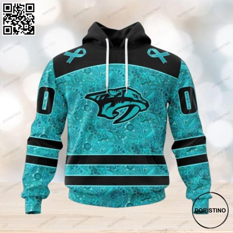 Nashville Predators Special Design Fight Ovarian Cancer All Over Print Hoodie made from a blend of 90% polyester and 10% spandex.