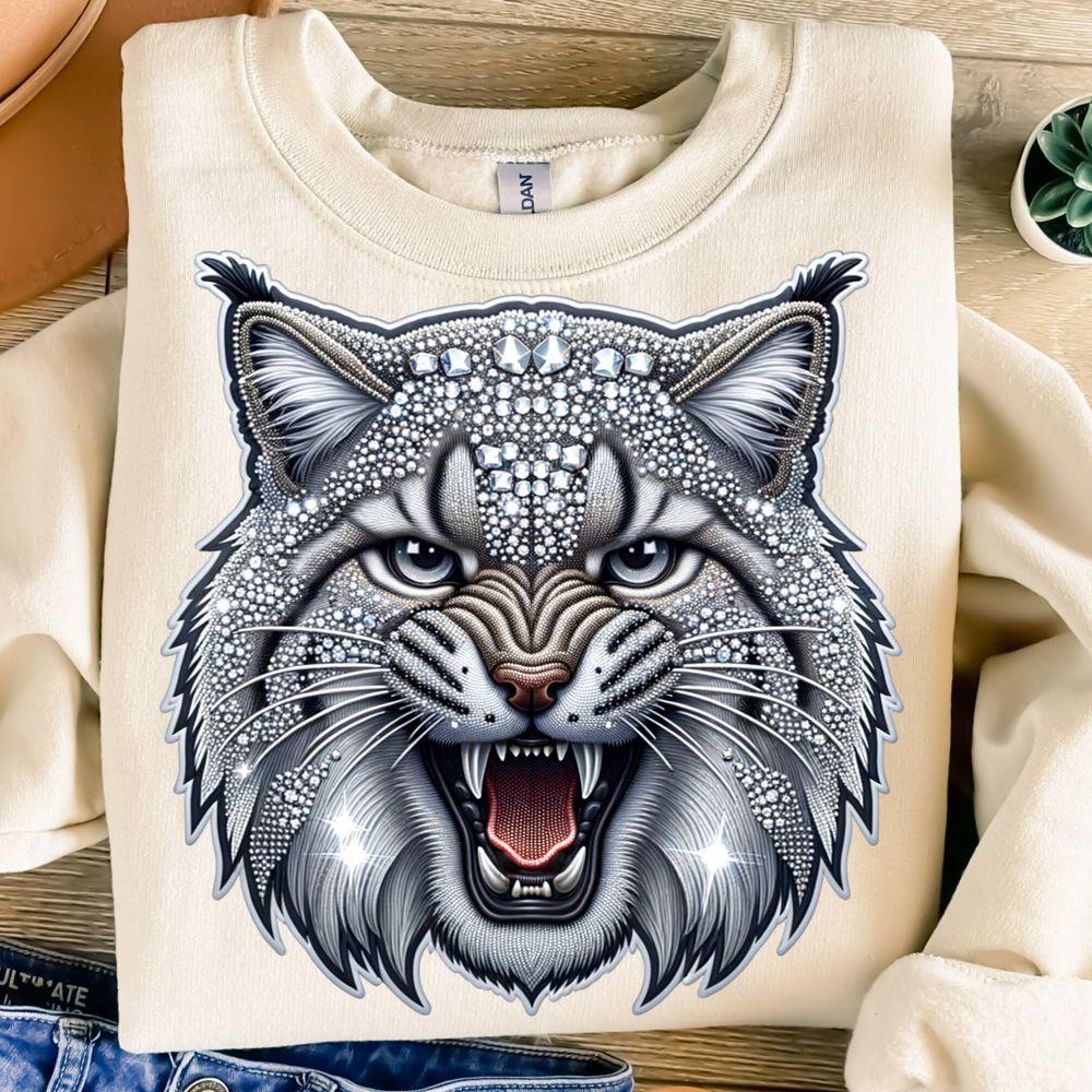 Sparkly Silver Bobcattion Design Faux Embroidery Rhinestone Wildcat Sweatshirt (Gildan’s classic)