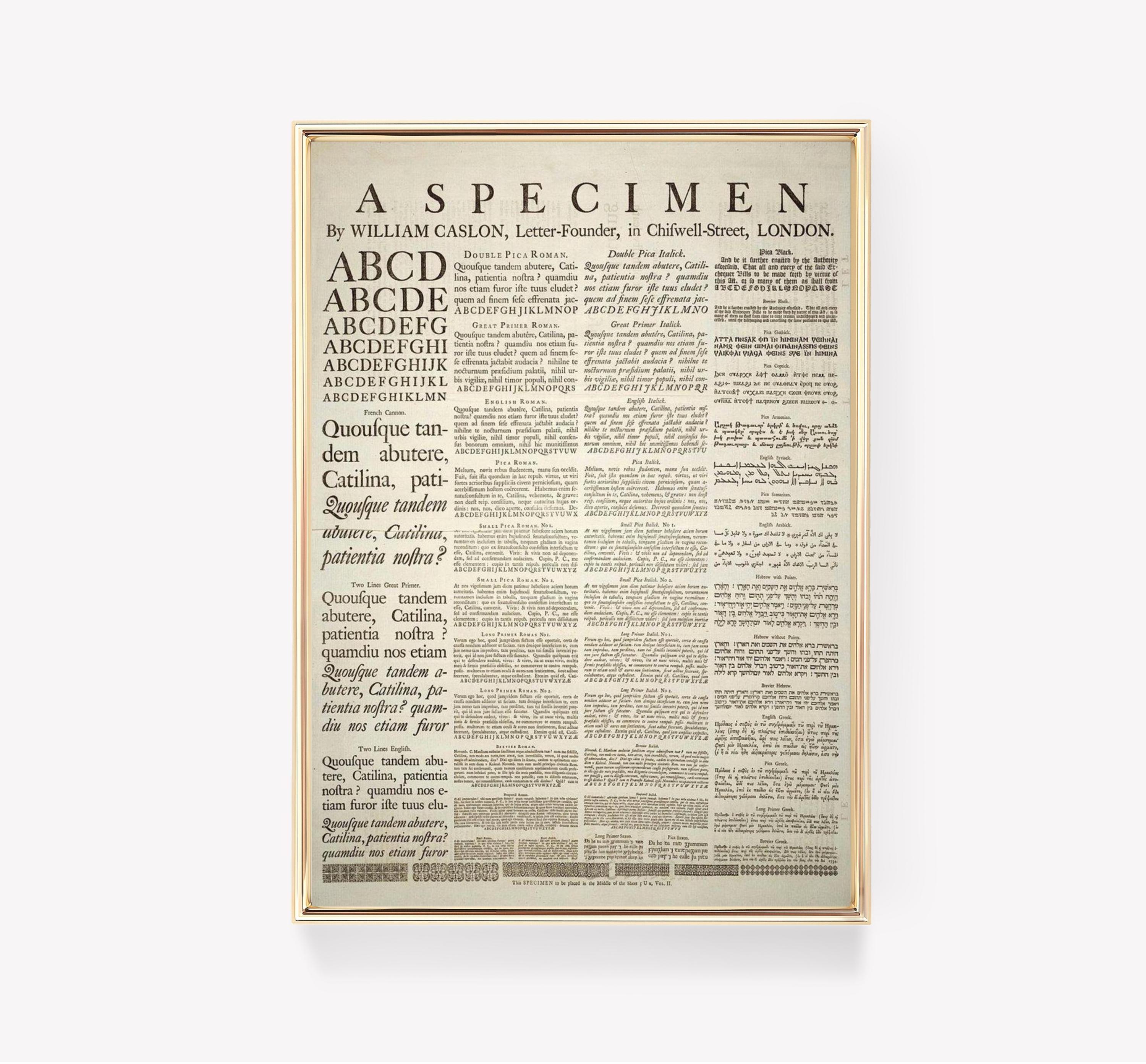 Printed on an premium luster photo paper, William Caslon posters are printed in San Francisco, CA. They are premium luster photo paper for best quality, with a high contrast black and white. The poster base has been coated with an edible resin coating that allows it to be safely stored away from direct light. High-quality resin-coated photo base paper medium A 260 gsm and a 10 mil thickness of paper. Last up to 200 years color and 400 years black-and-white